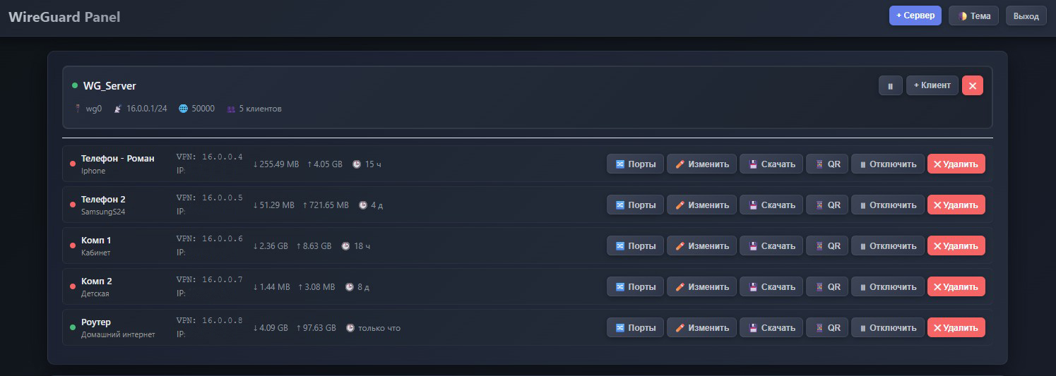 - Онлайн/офлайн: Клиент онлайн если handshake < 30 секунд (PersistentKeepalive = 10 сек)